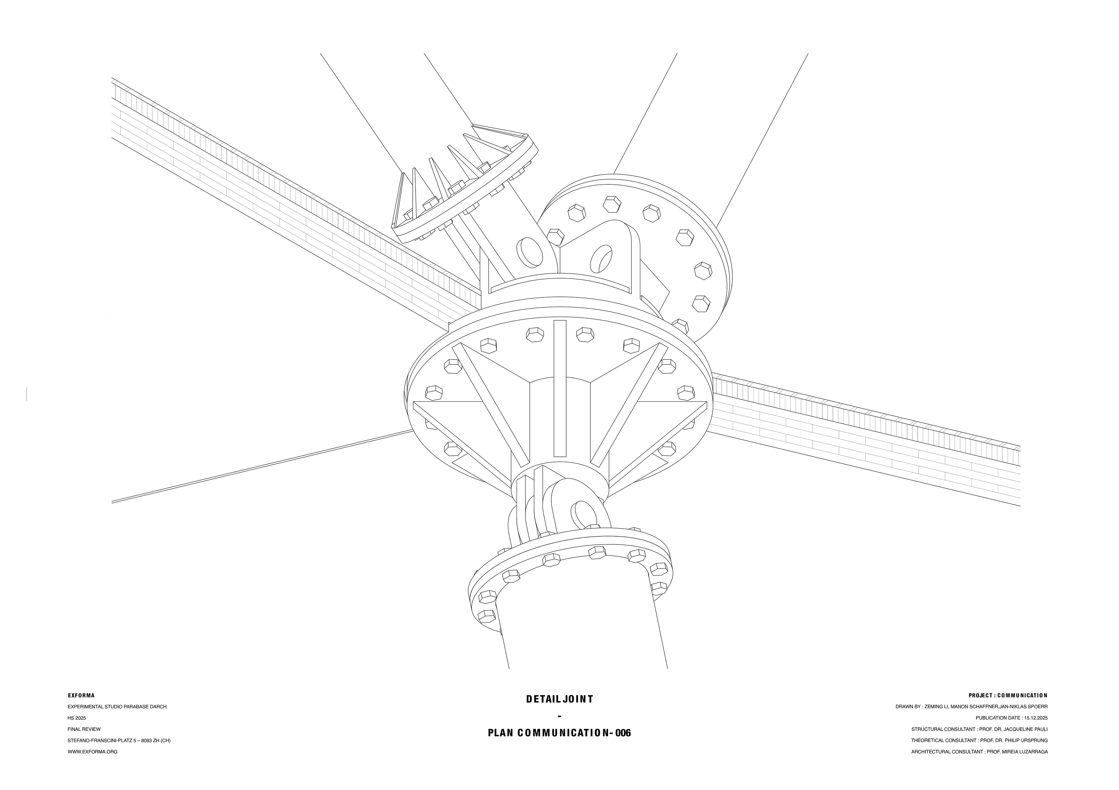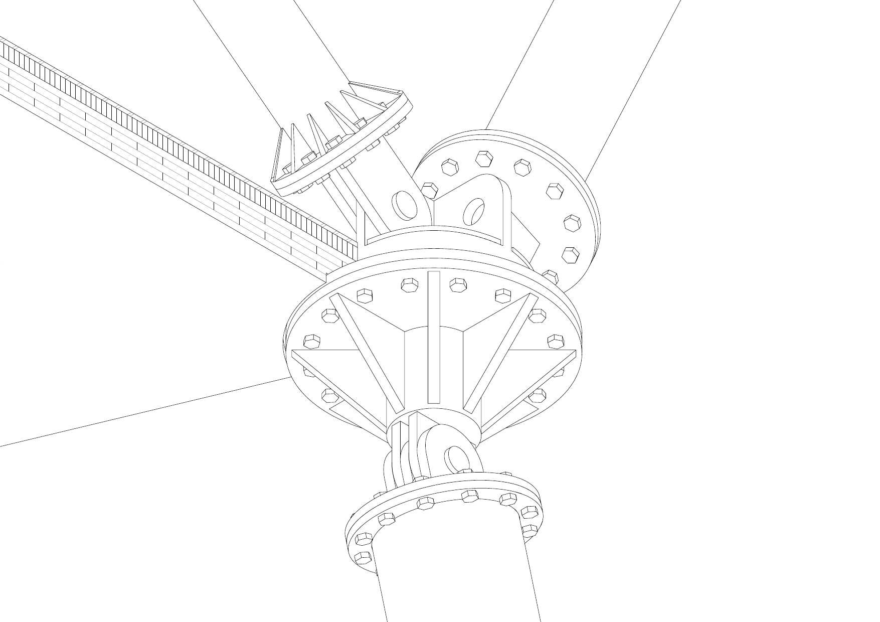 Where branches meet, custom steel nodes transfer forces between members of differing diameters and inclinations. The joint design builds upon existing flange connections standard to monopole construction: circular bolt patterns that originally stacked tower segments vertically are rotated to receive inclined members.