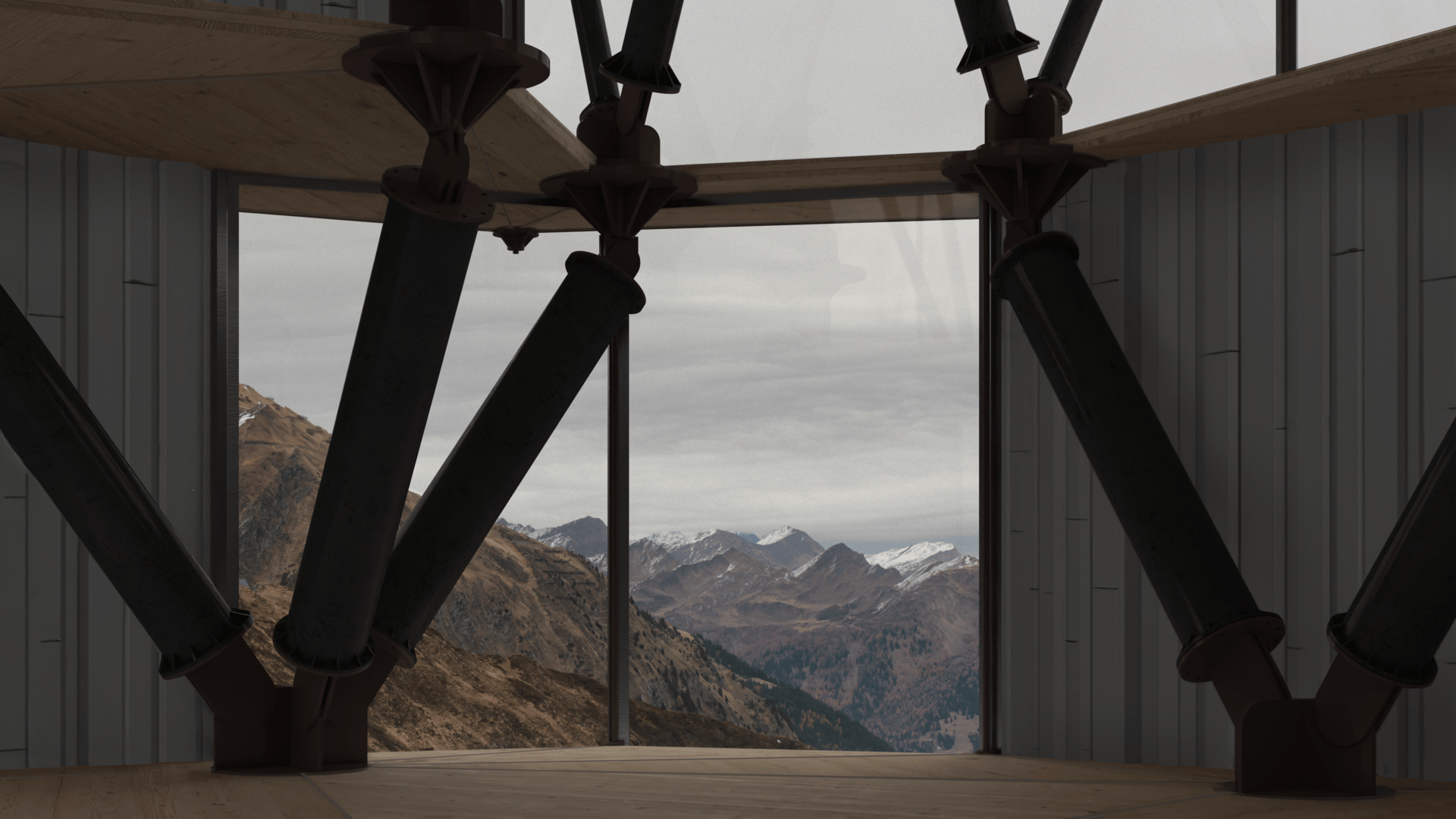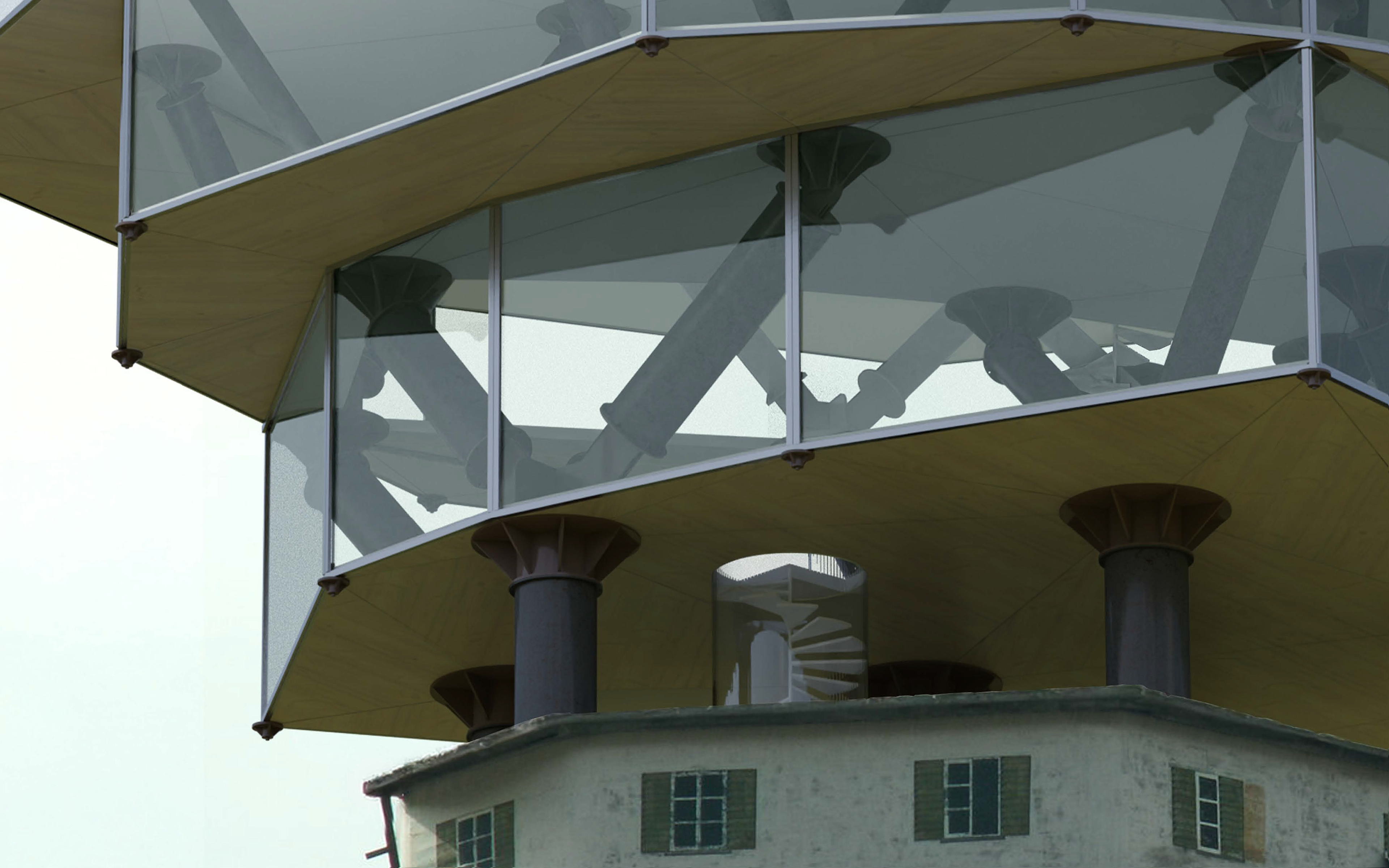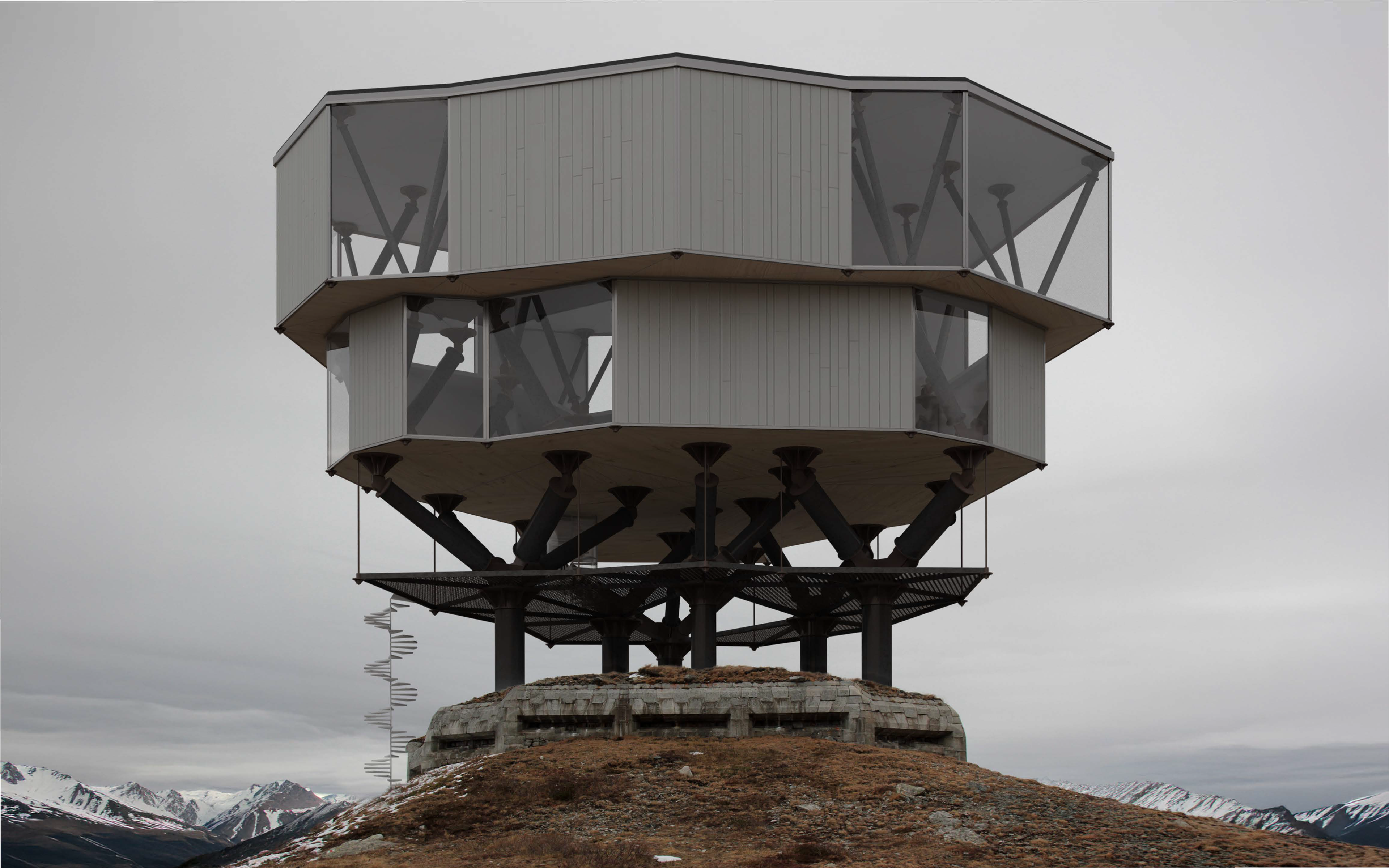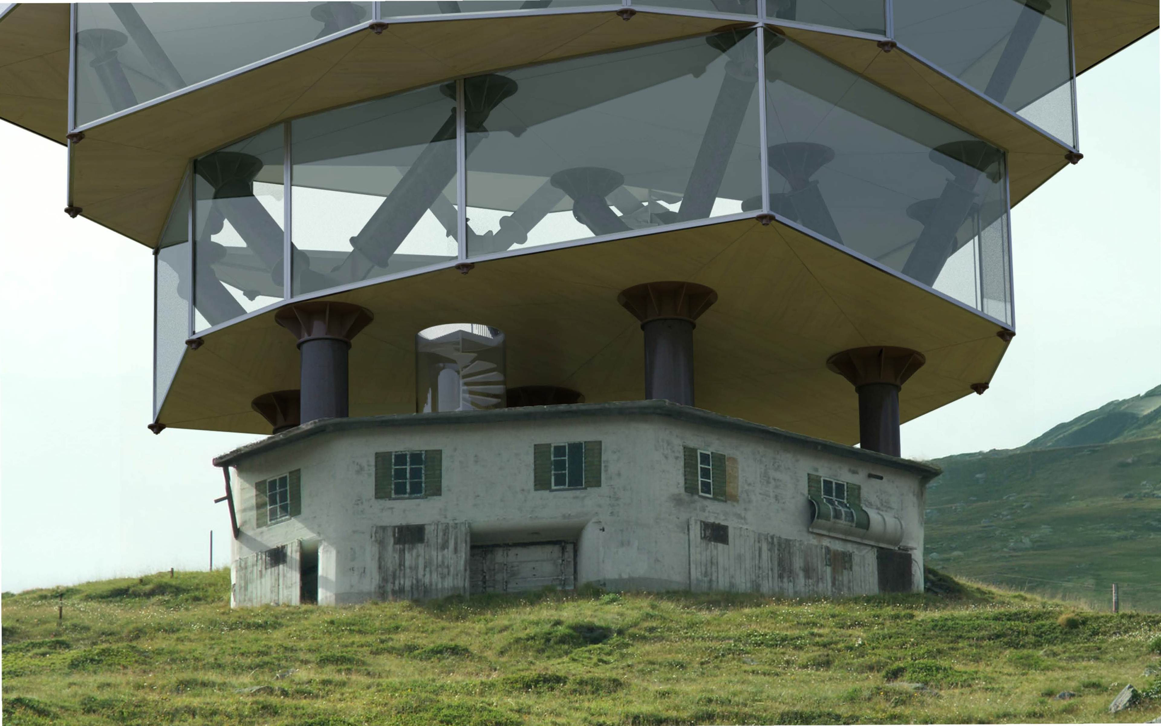 The project reads Switzerland's landscape as layered infrastructure: agricultural territory overlaid with military fortification overlaid with broadcast transmission overlaid with data networks. Each layer partially obscures the previous while depending on inherited conditions—road access, power connections, communication lines. The tree structures add another layer, one that synthesizes materials from the broadcast network with sites from the military network to support the data network.
