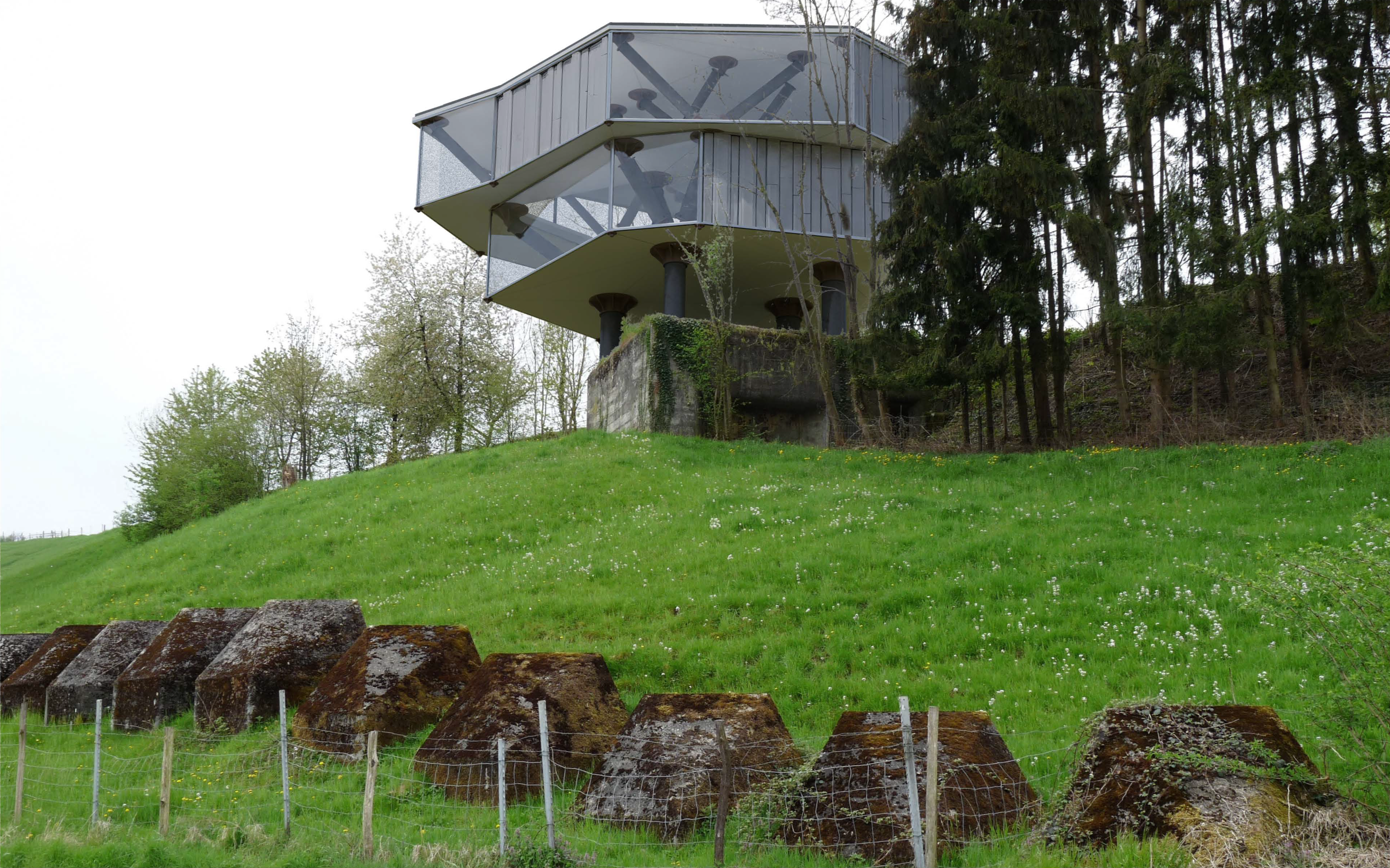 The monopole tree structures emerge from bunker access points, supporting flexible work environments above the concealed data infrastructure below. Floor plates span between branching steel members, offering open workspace within the structural canopy. The architectural expression inverts the bunker's logic of concealment: where military construction disappeared into landscape, the tree structures rise visibly above it.