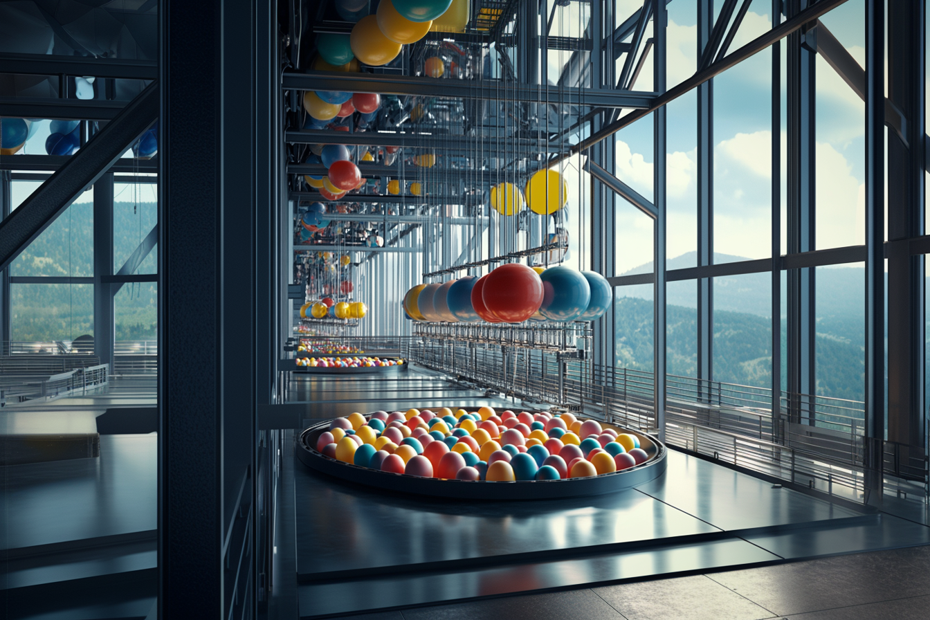 A hum fills the space, a perfectly orchestrated symphony of creation. No hands, no voices, no errors. Inhaling air and exhaling balloons. Each one identical, smooth, hollow and shiny.