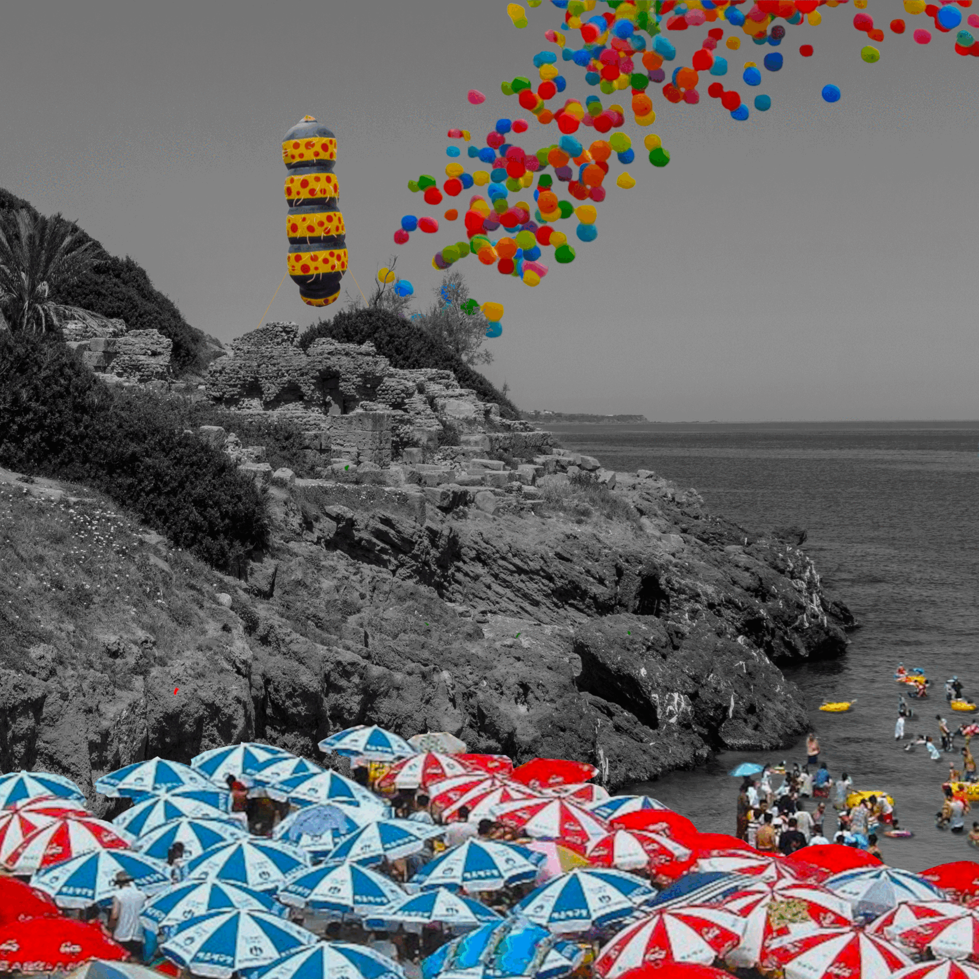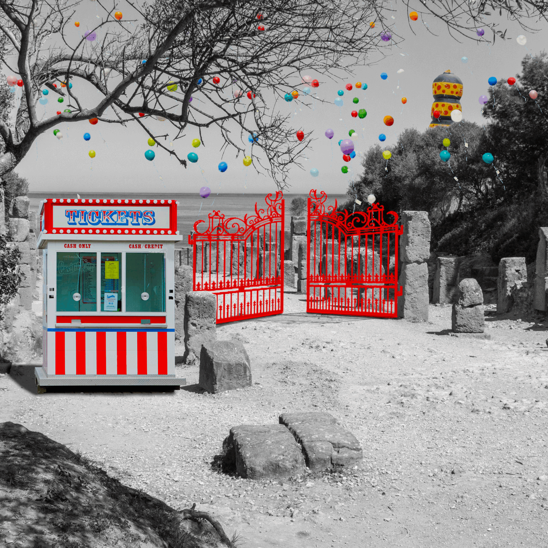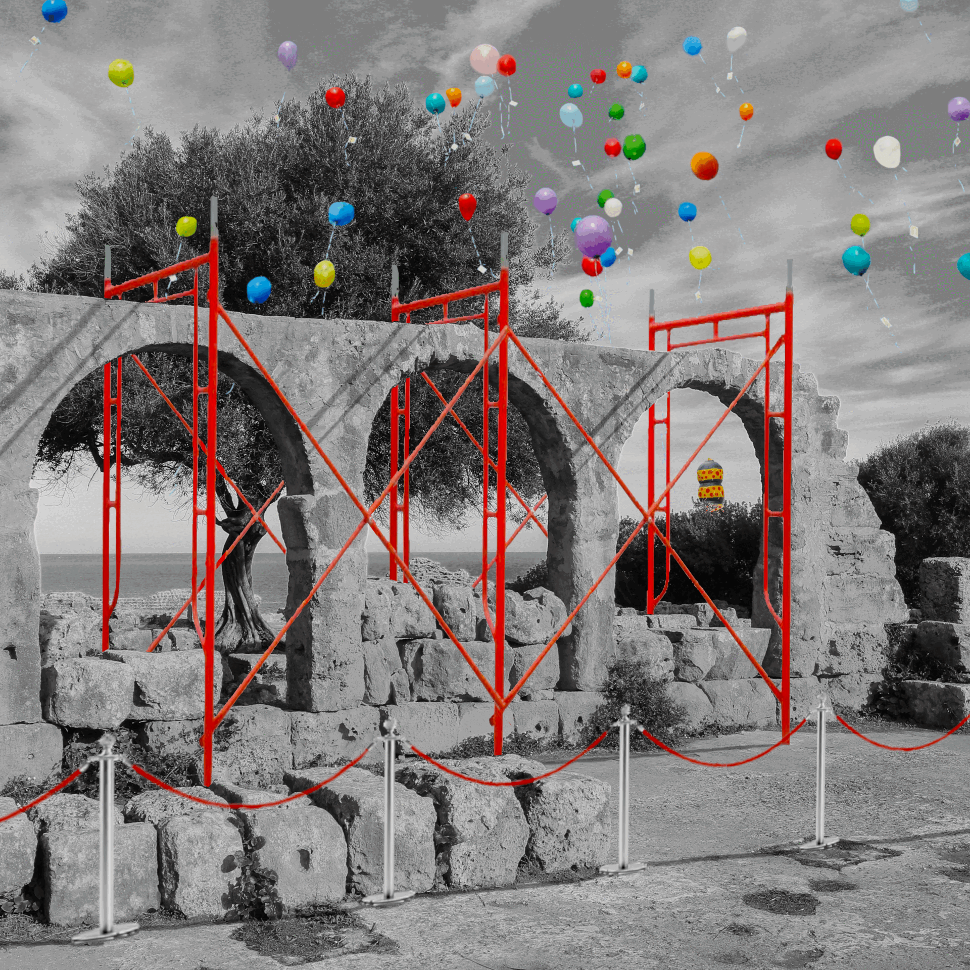 They pass over the ruins, indifferent to the stillness below. The arches and stones remain unchanged, their quiet weight unbroken by the chaos above. The moments once born there, fleeting and grounded, now dissolve into a sky overrun with hollow shapes, each balloon fighting for space, for meaning, for something it cannot hold. "Mere anarchy is loosed upon the world."[3]