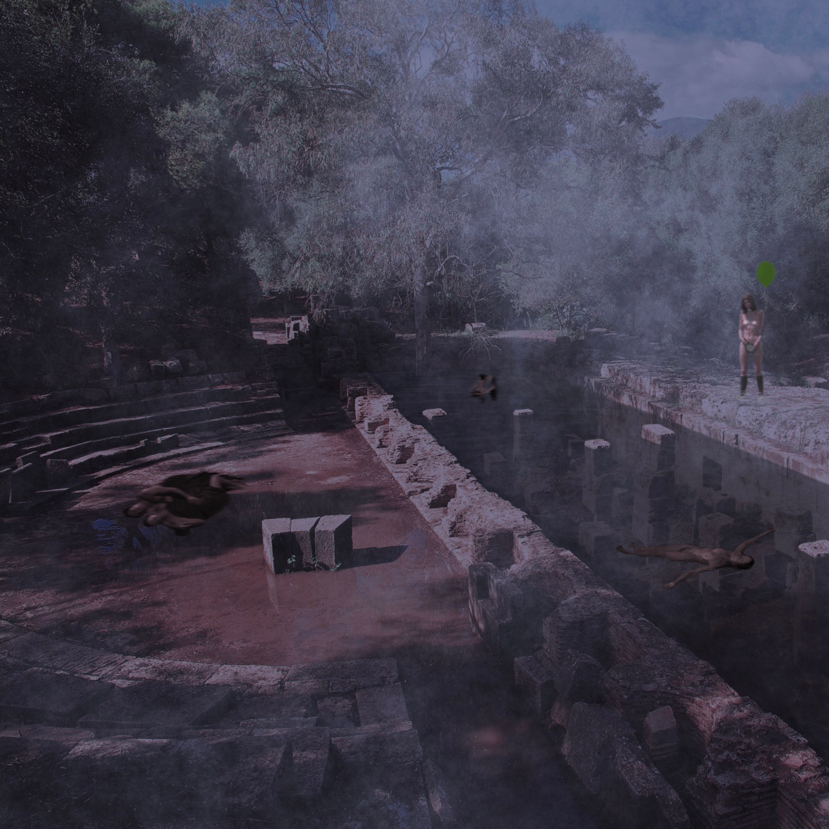 The balloons, once bright against the sky, now lie scattered across the ruin - deflated, forgotten remnants of the last moments. They cling to stones, limp and lifeless, their colors dulled by the night. “Every moment there is creation, every moment destruction.”[2]