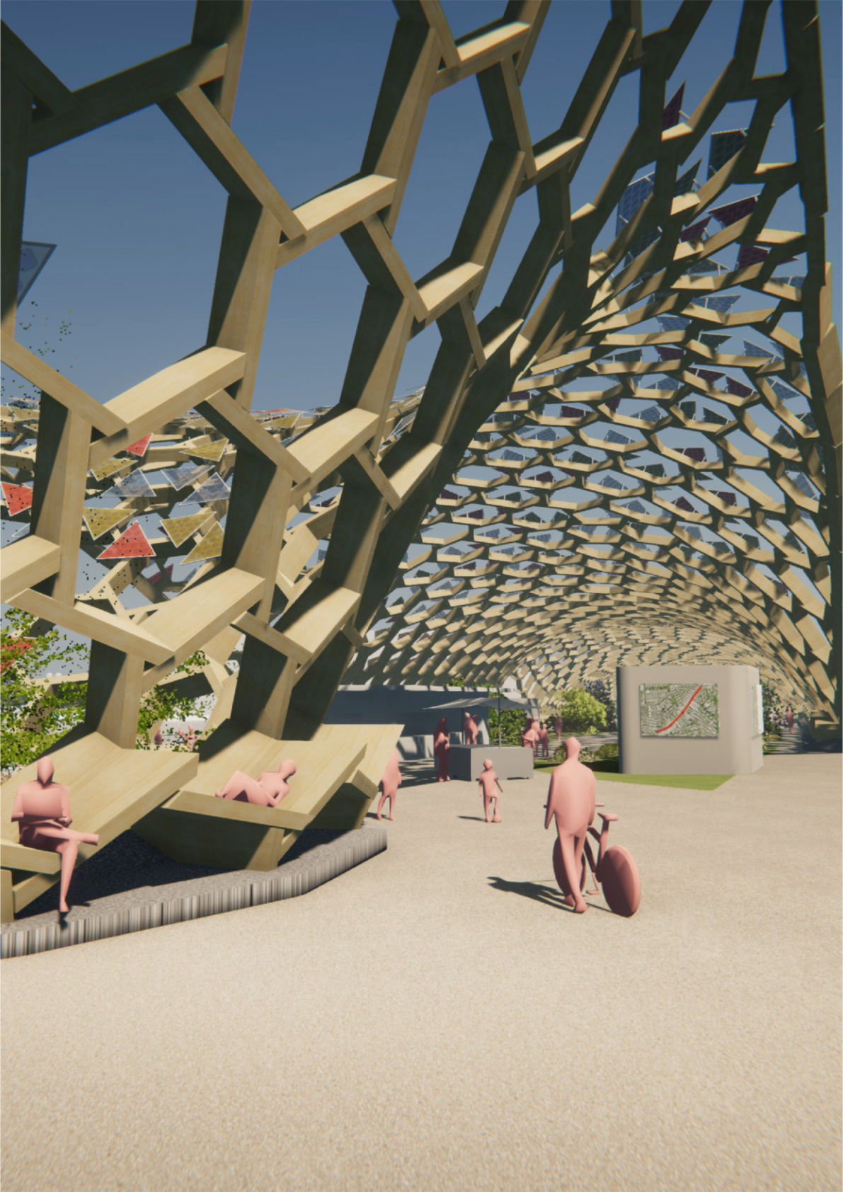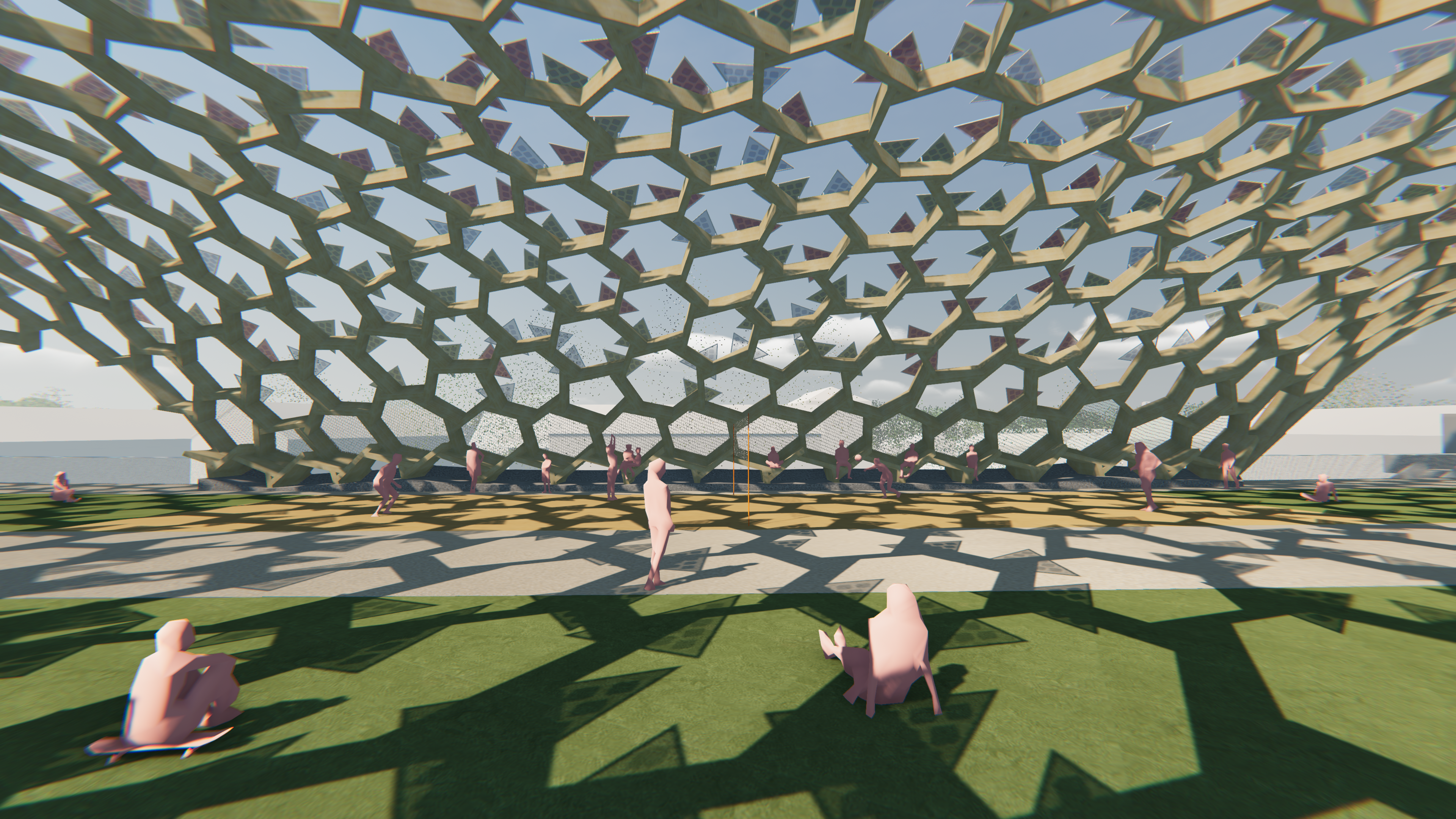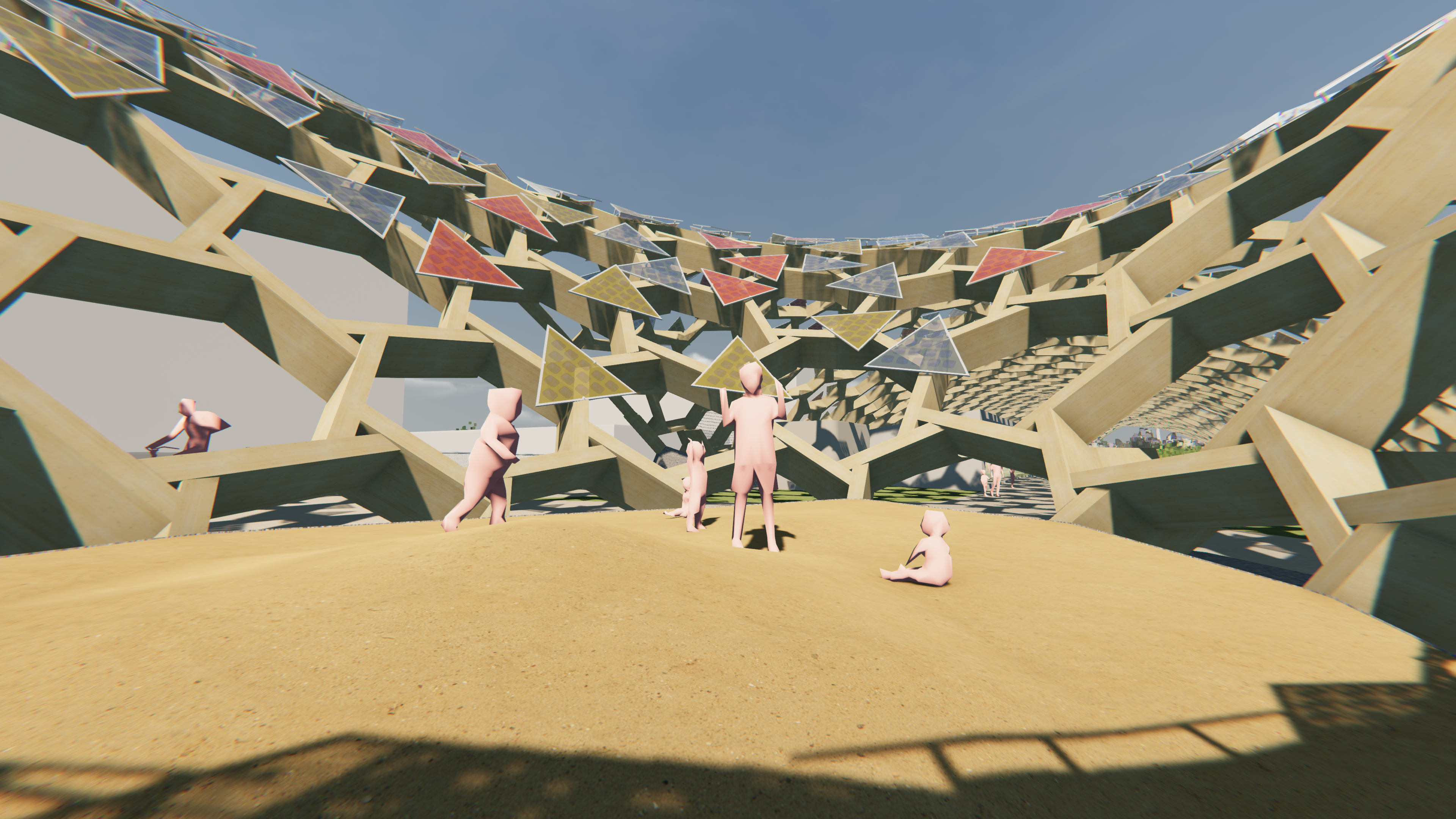 After the wooden frame was mapped on the entire roof shell, the PV panels were mounted on the frame. The triangular panels consist of rods, frame and glass, and PV cells. The glasses are randomly assigned in three colors to allow colorful light to enter below the undulating roof, creating colorful and vibrant "interiors".
