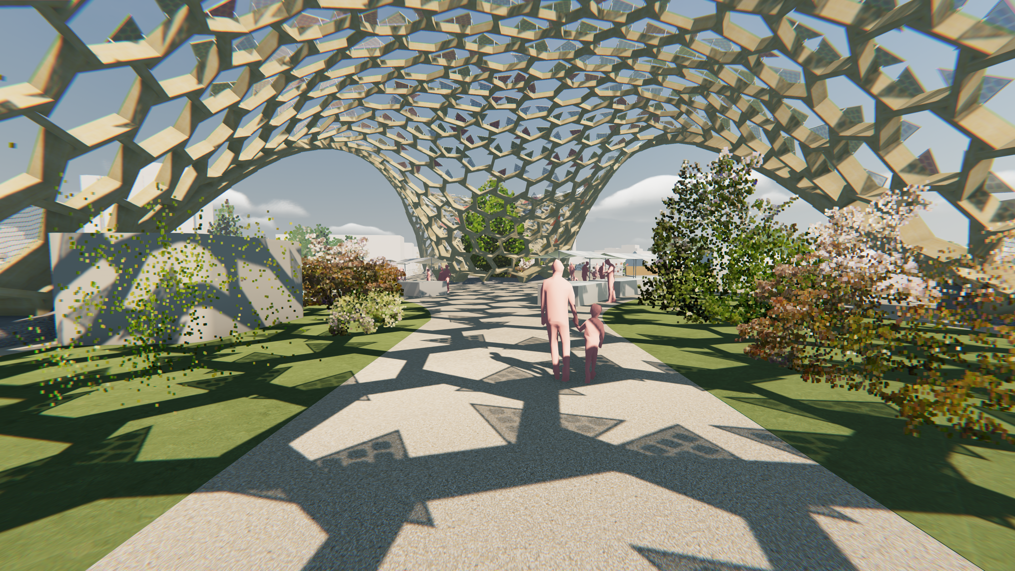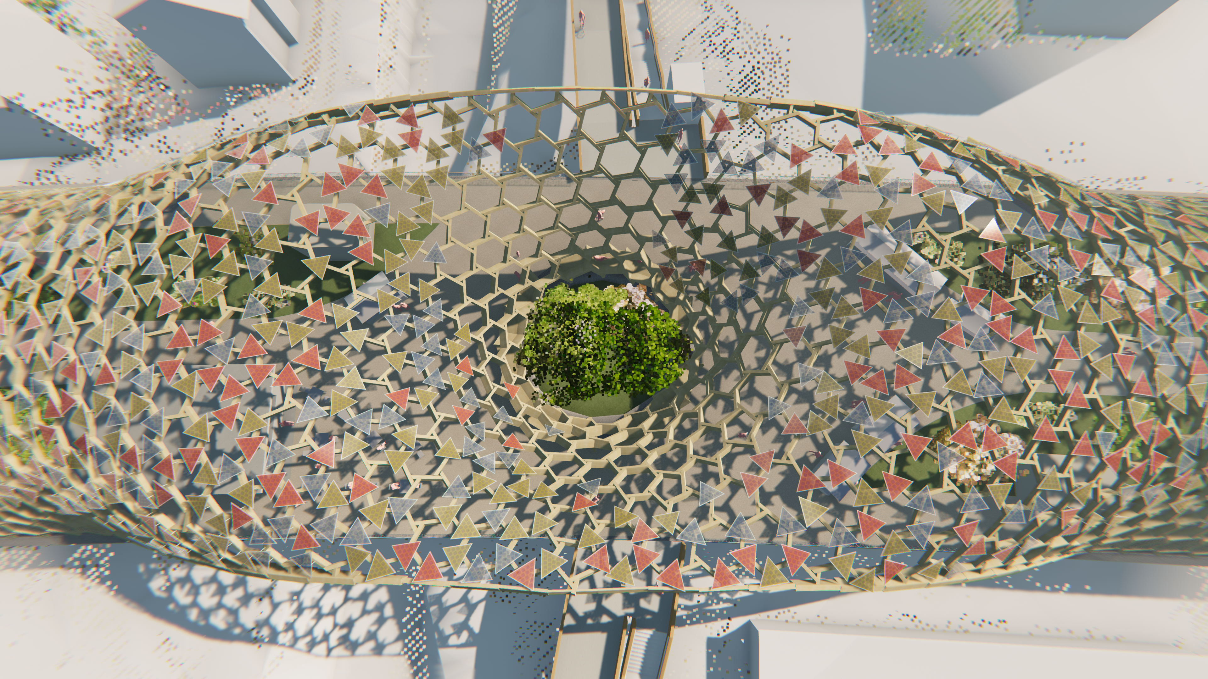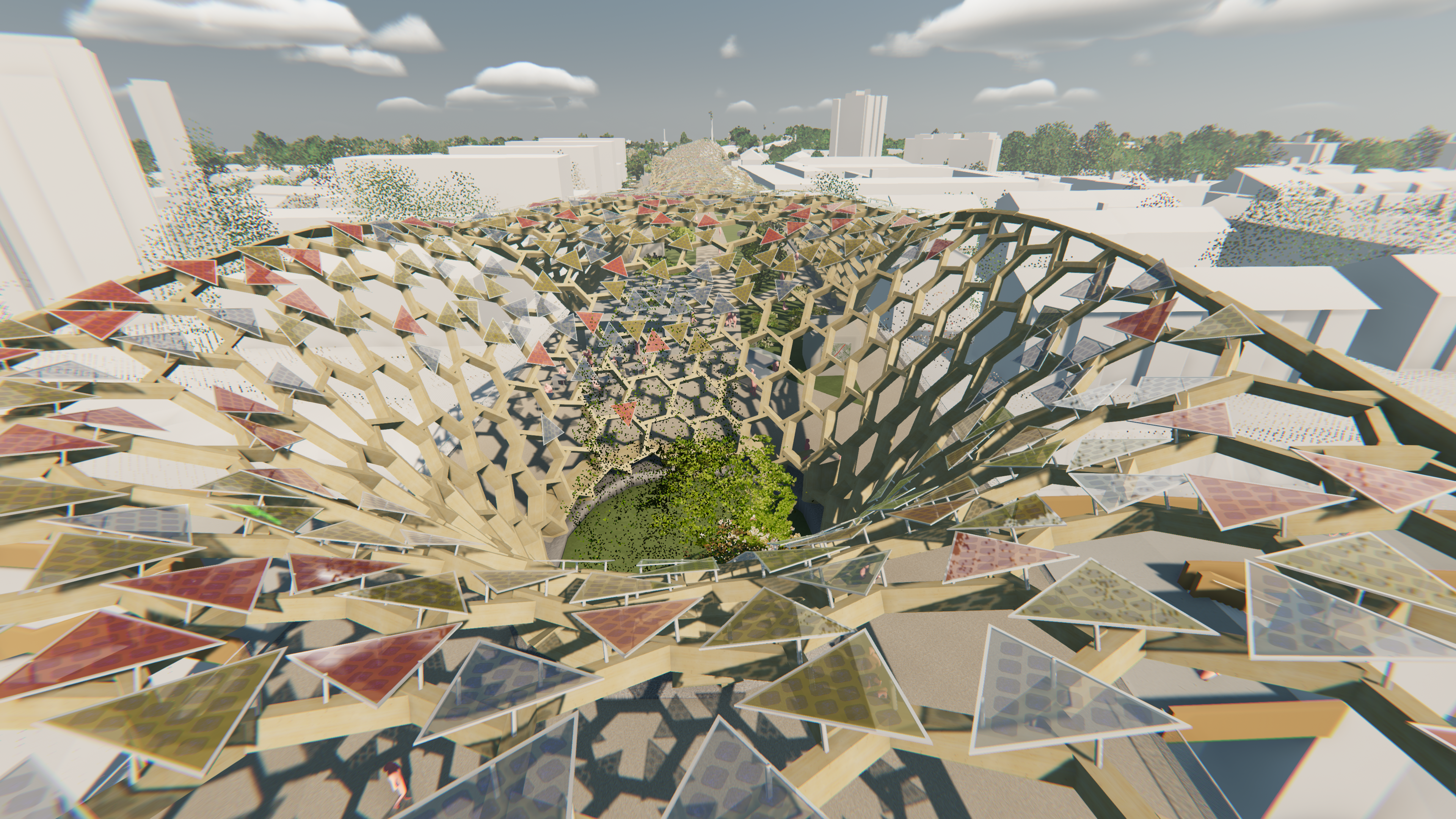 After the wooden frame was mapped on the entire roof shell, the PV panels were mounted on the frame. The triangular panels consist of rods, frame and glass, and PV cells. The glasses are randomly assigned in three colors to allow colorful light to enter below the undulating roof, creating colorful and vibrant "interiors".