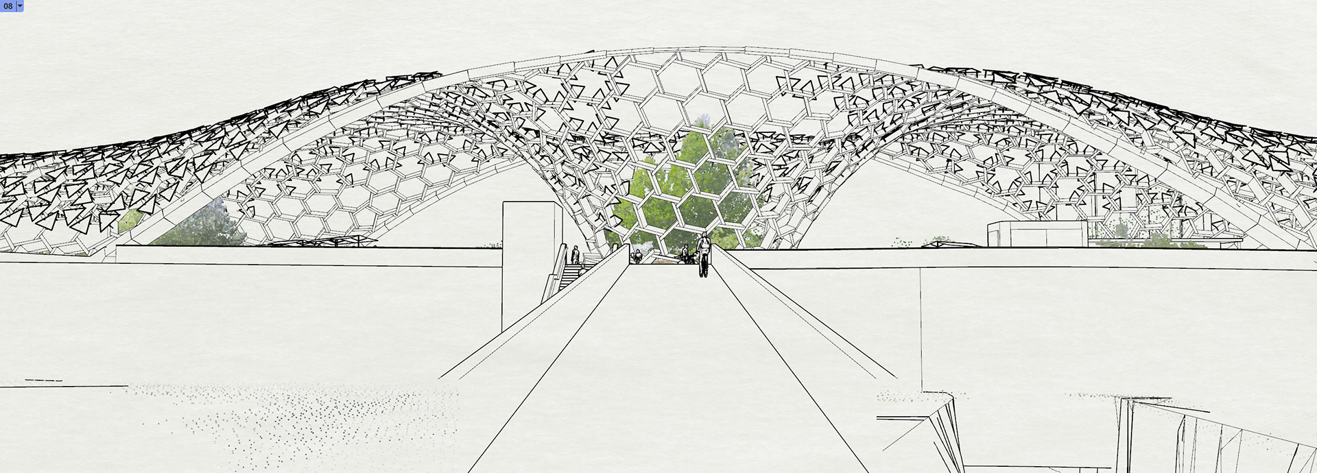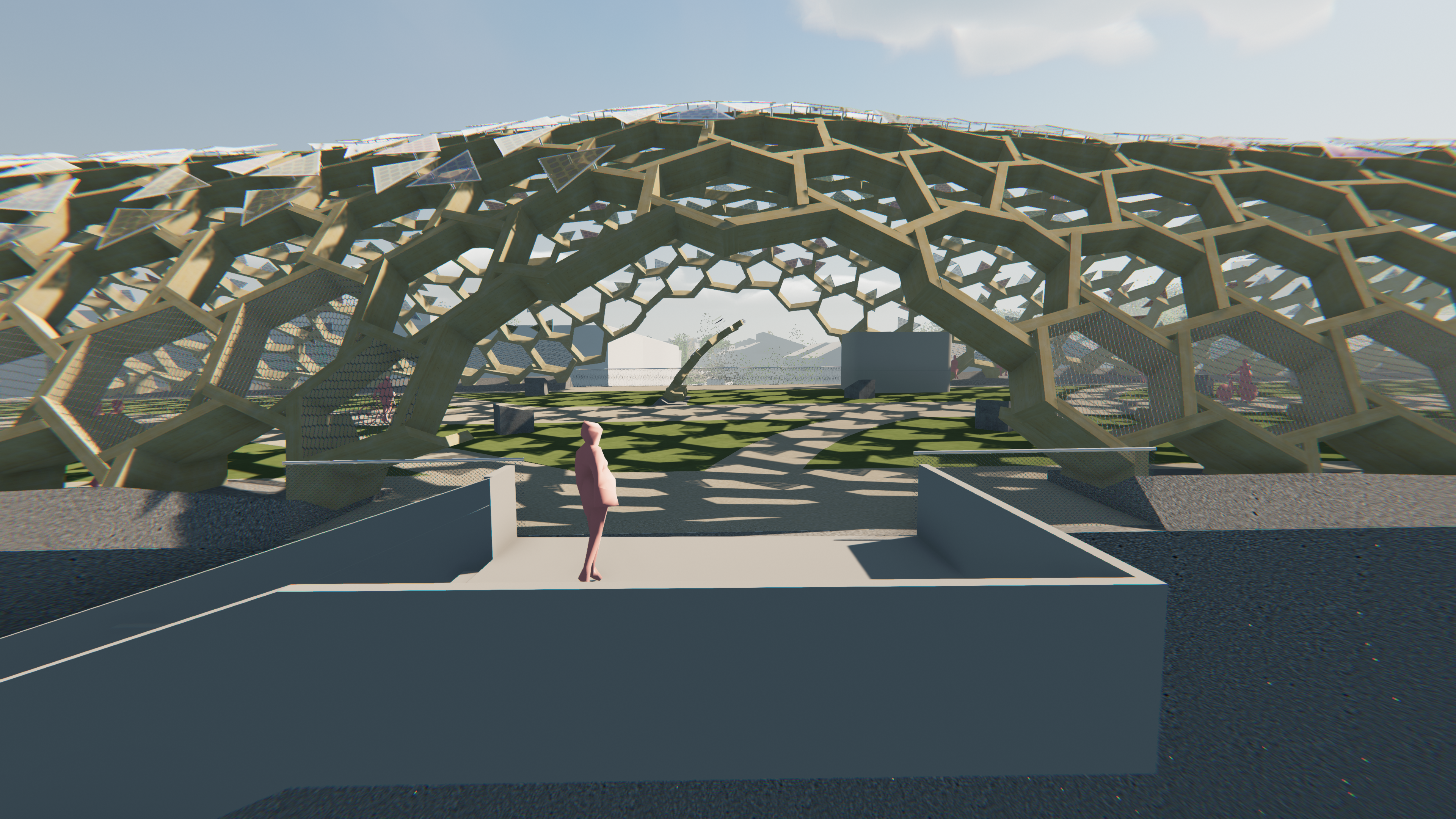 This semester, we want to design a second level of use for the enclosure above the park that will enter into a dialogue with the existing landscape architecture project by Krebs and Herde. An integral part of this design will be a large-scale PV system supported by a wood pole structure.