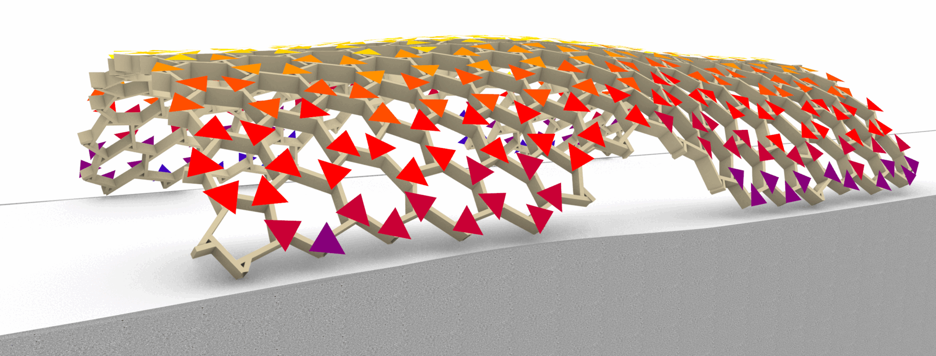 Module 2: To convert the surface into a reciprocal structure, it is first triangulated and then combined into polygons. It is crucial to orient these polygons as uniformly as possible. By slightly rotating the bars, the supporting elements establish a reciprocal relationship with one another.